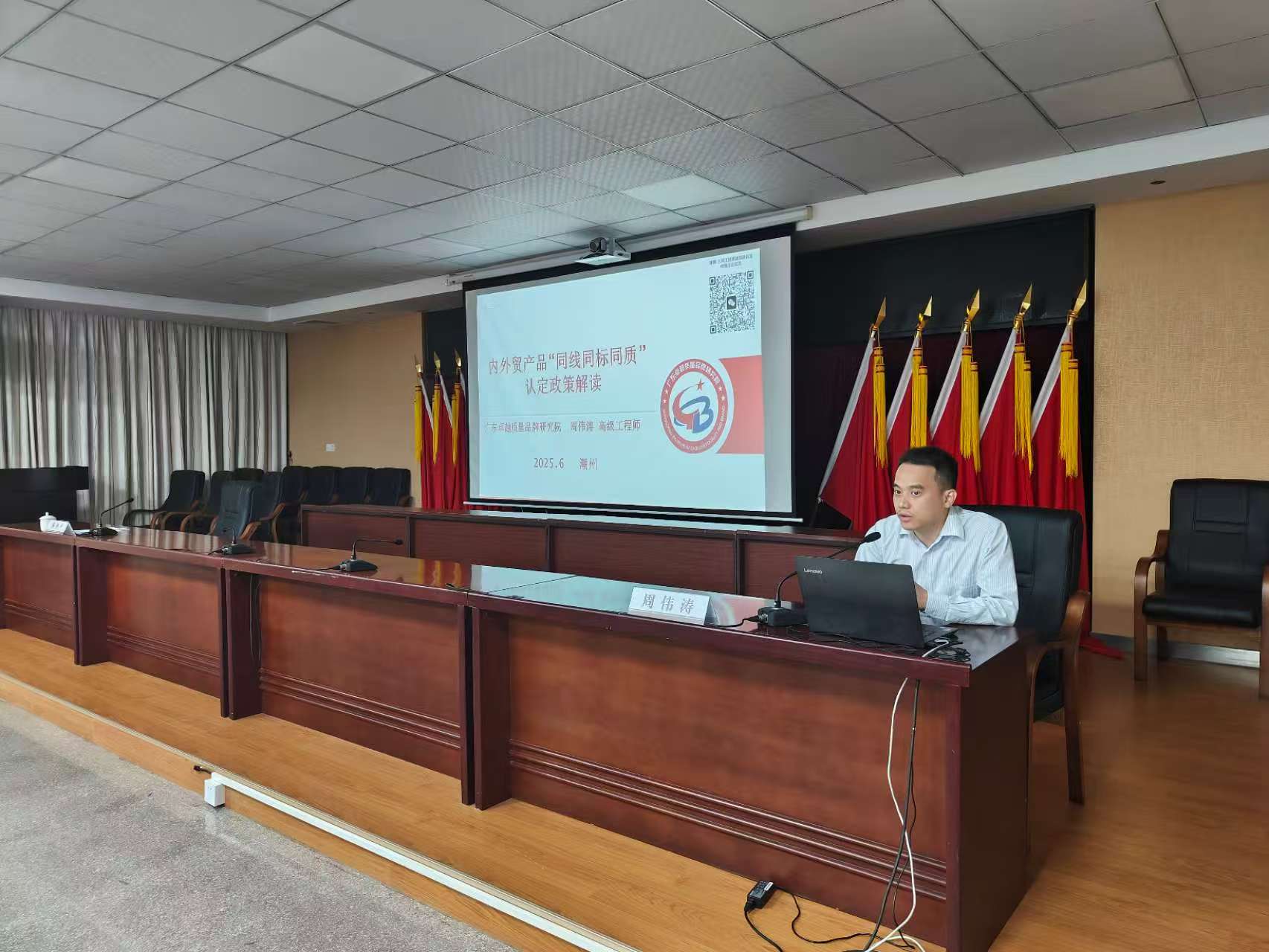 在活动中,我院周伟涛副院长为到场企业代表详细解读了内外贸产品 “同线同标同质” 认定政策,对 “三同” 产品的申报流程、审核标准及扶持政策等方面进行了全面讲解,为企业提供了清晰的操作指南。通过此次宣讲,企业代表们对内外贸产品 “同线同标同质” 认定政策有了更深入的理解。