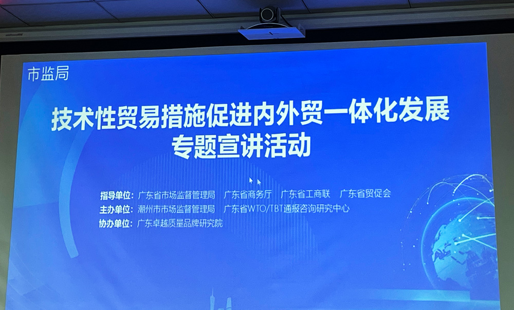 2025 年 6 月 13 日上午,广东卓越质量品牌研究院受邀参与由潮州市市场监督管理局主办的 “技术性贸易措施促进内外贸一体化发展” 专题宣讲活动。 此次宣讲活动在潮州市市场监管局八楼会议室举行,吸引了来自陶瓷、食品、服装等多个行业的 60 家企业代表参加。